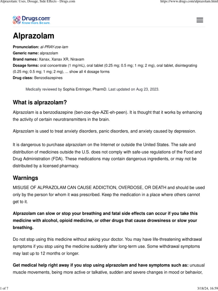 Complementary research on "Alprazolam Uses Dosage Side Effects Warnings" encompasses: Alprazolam: Uses, Dosage, Side Effects, Warnings, Xanax: Uses, Dosage, Side Effects & Warnings, Alprazolam: Para qué sirve, Dosis y Efectos Secundarios, plus related subjects.