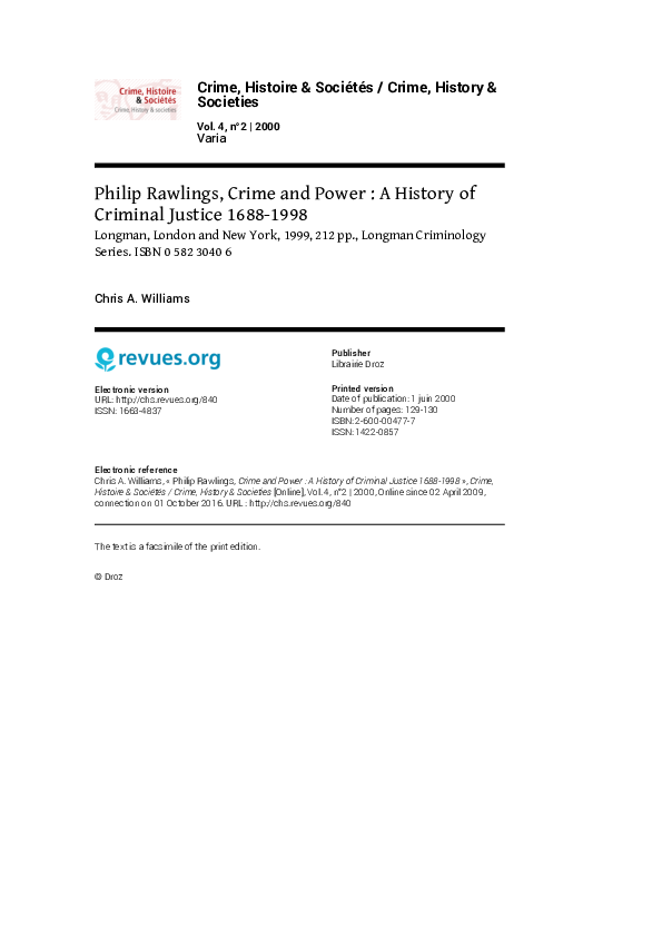 Crime And Power A History Of Criminal Justice 1688 1998 Origins And Development Of Criminal Justice Policy 1700 1997 Longman Criminology Series Pdf Detailed Analysis
