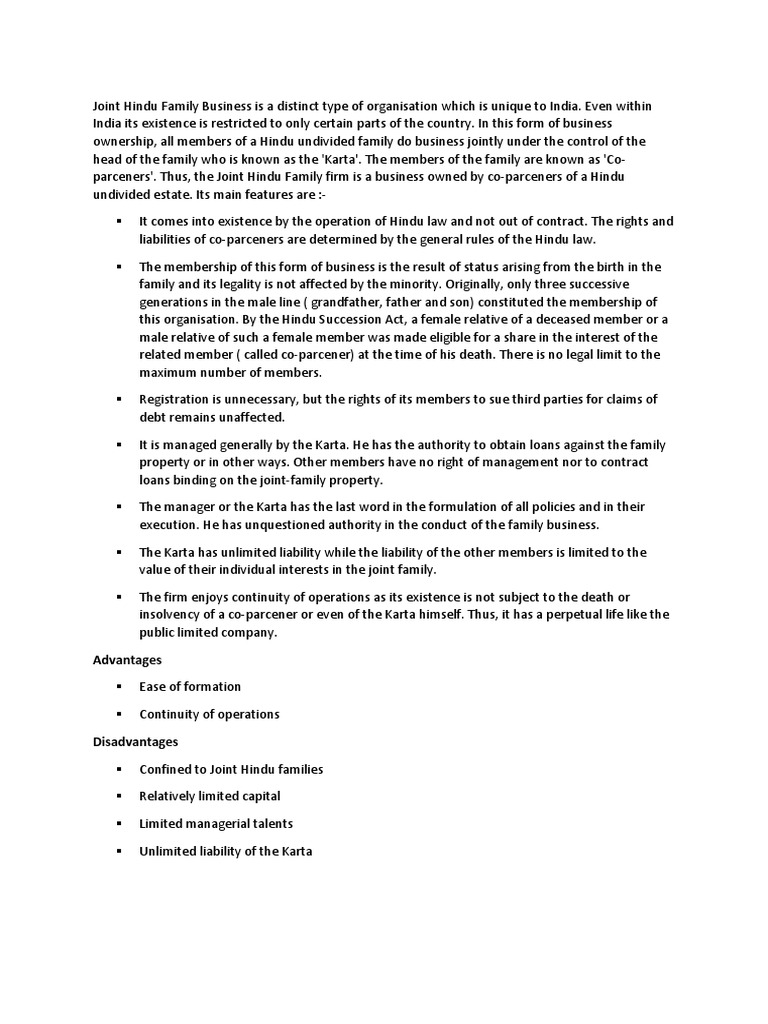 Joint Hindu Family Business Project Information Detailed Analysis